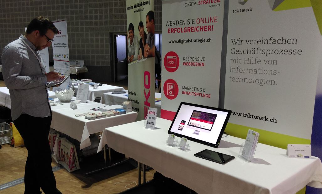 Letztes Jahr haben wir an der AGLAT 14 teilgenommen, die Gewerbeausstellung des Gewerbeverein KMU Laufental. Unser primäres Ziel war es, den Namen "taktwerk" in den Köpfen zu verankern und mit unseren Personen zu verbinden. Da die AGLAT eine Publikumsmesse ist, war uns von Beginn an bewusst, dass wir dort nicht direkt etwas verkaufen werden - unsere Kunden sind in der Regel eher auch selber Aussteller.
